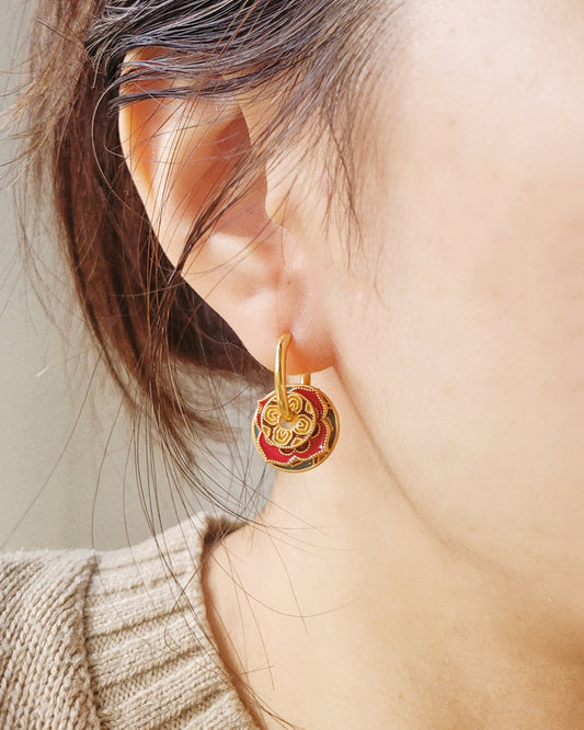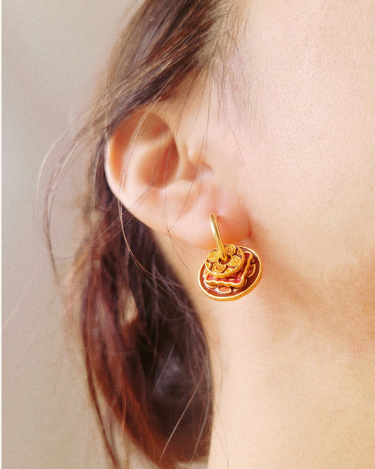 Enamel Disc Earrings | Retro Red & Brown Pattern