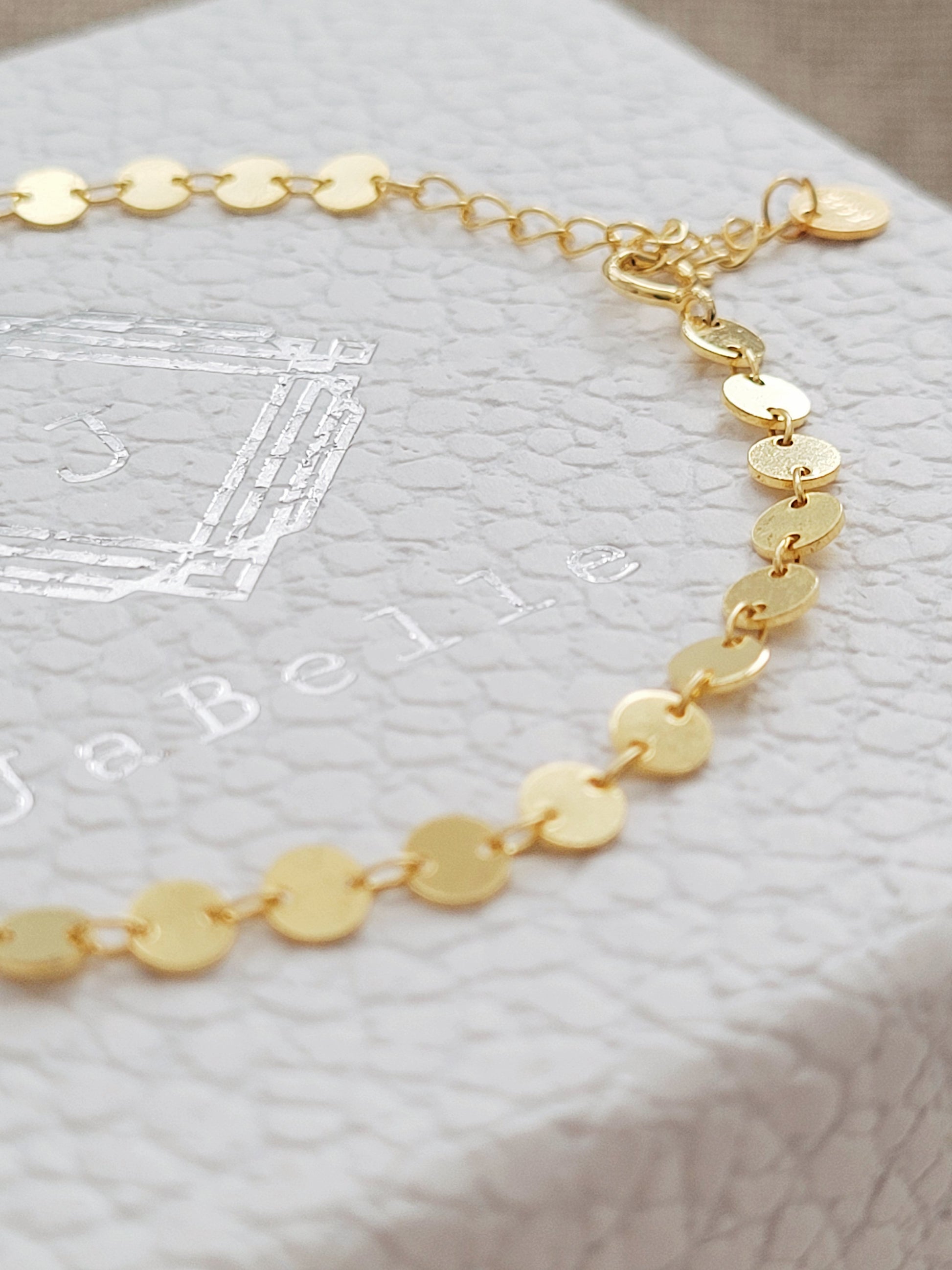 This dainty gold Discs Bracelet is crafted in sterling silver with 18ct gold plating. Simple design provides a harmonious blend of contemporary and traditional aesthetics, making it the perfect choice for everyday wear. It can be worn alone or stacked for a personalized look.
