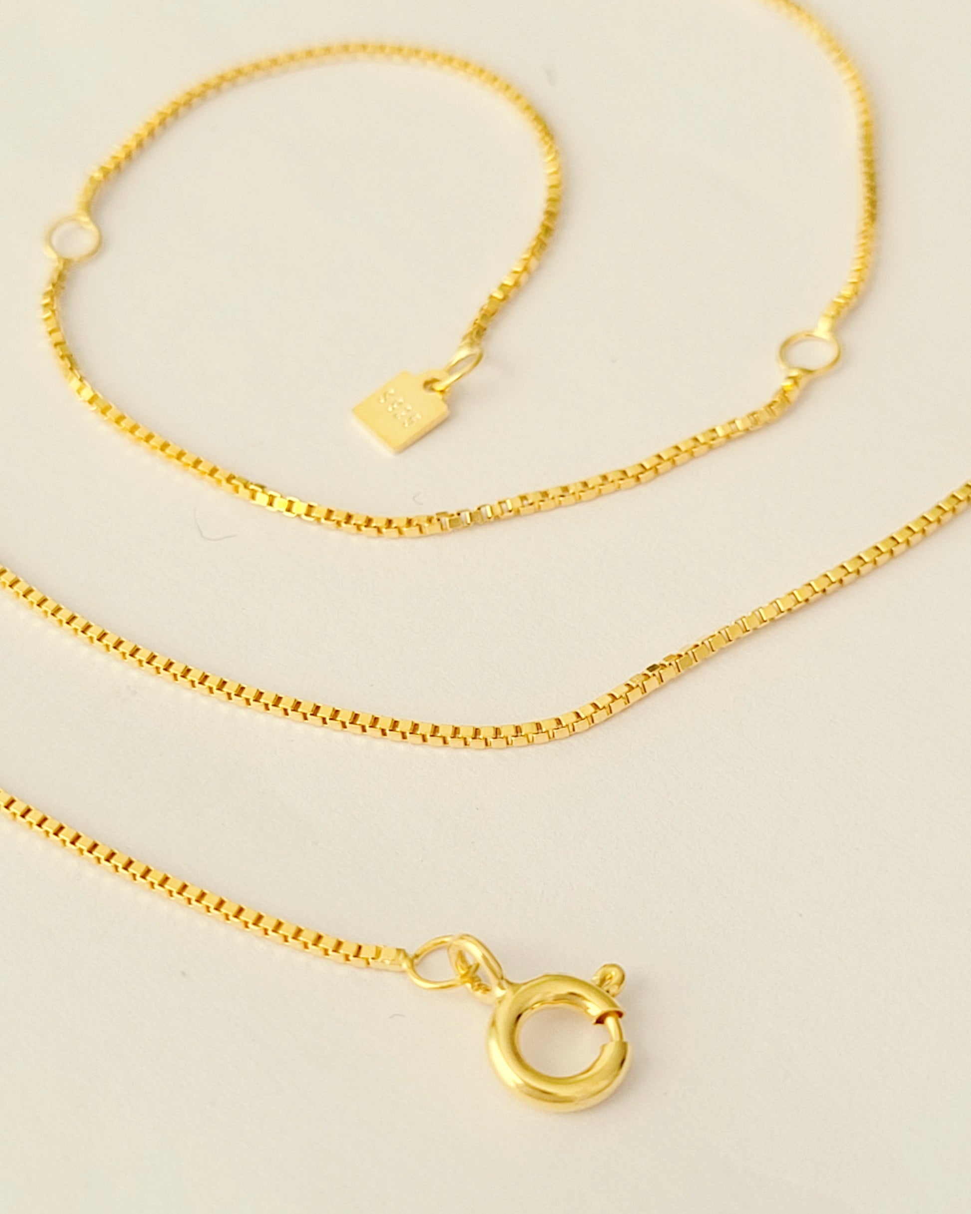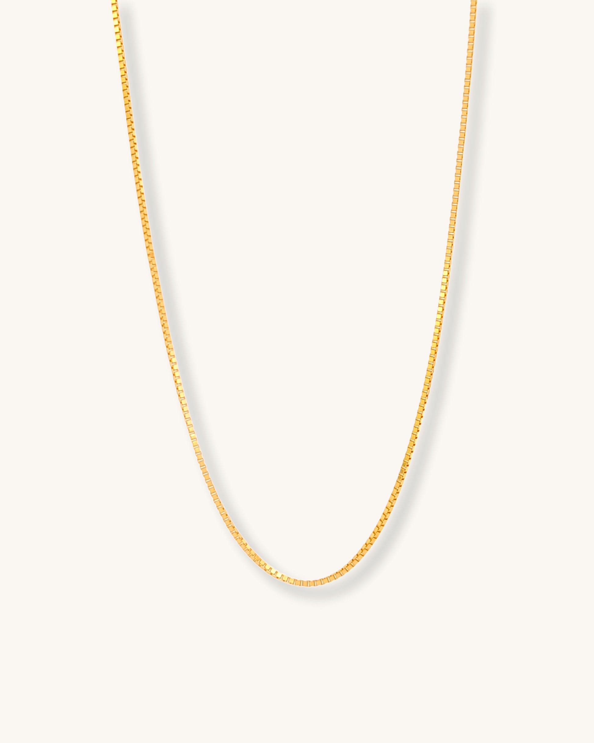 This dainty box chain catches the light with every movement; adding a beautiful touch of detail to your décolletage. Crafted in 100% 925 Sterling Silver and plated with 18k Gold, designed to be worn and loved for years to come. This chain has endless styling options whether you're layering up or wearing solo.