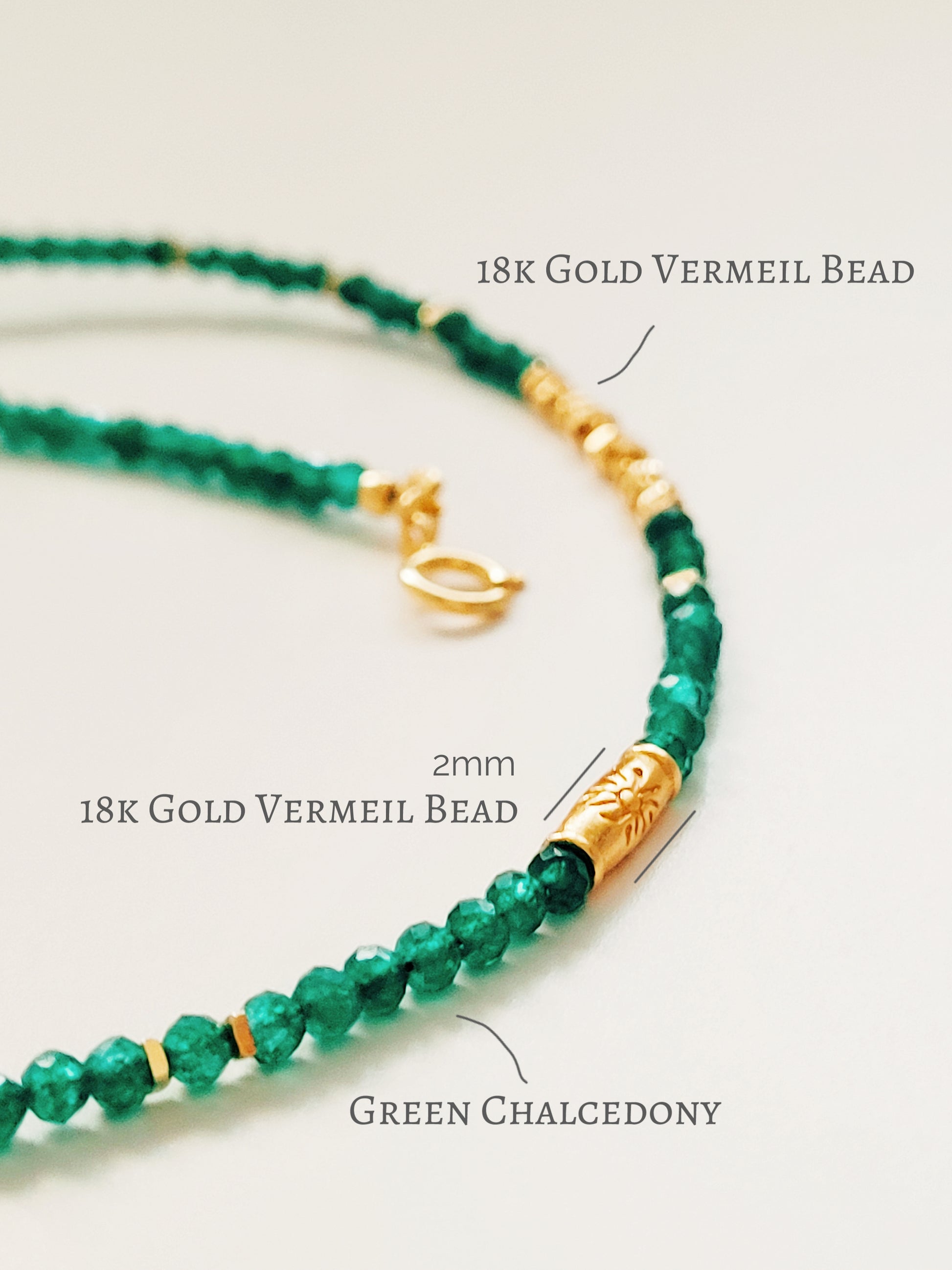 This stunning Green Onyx Necklace combines vivid green gemstones and luxurious 18k gold vermeil beads with a mini Sun charm. Handcrafted in a minimalist design, it is a timeless piece that complements any outfit, from casual daywear to evening elegance.
