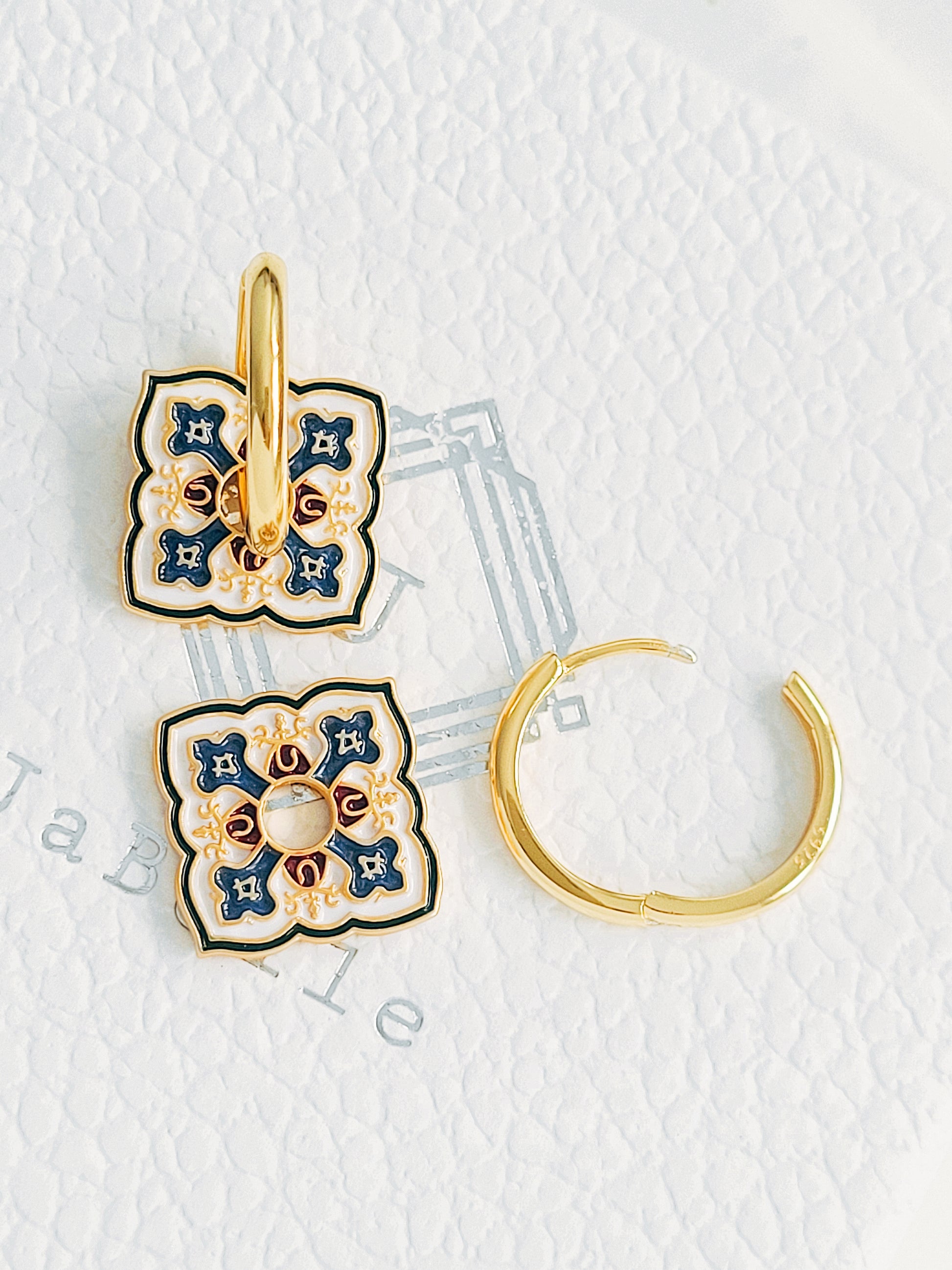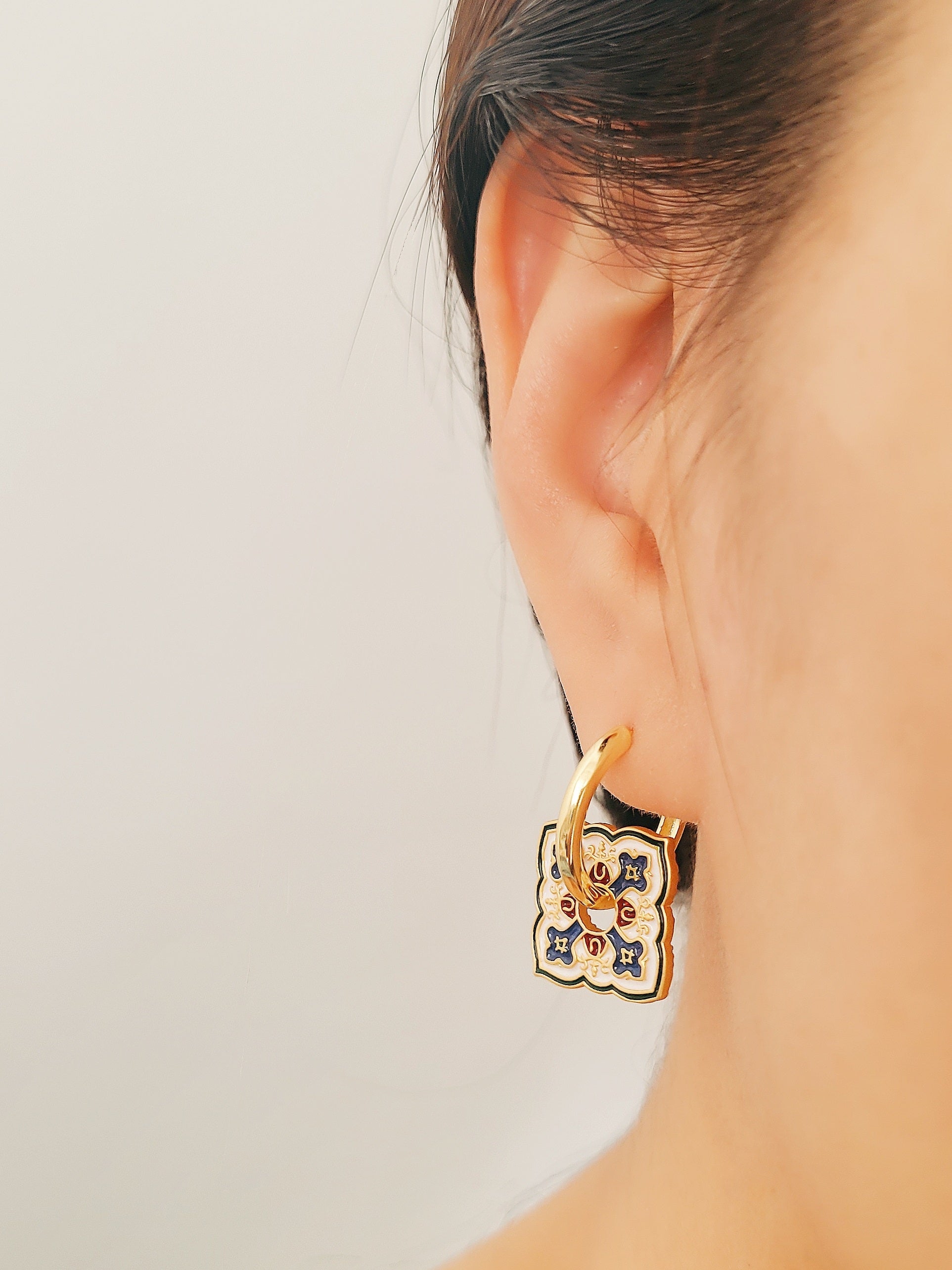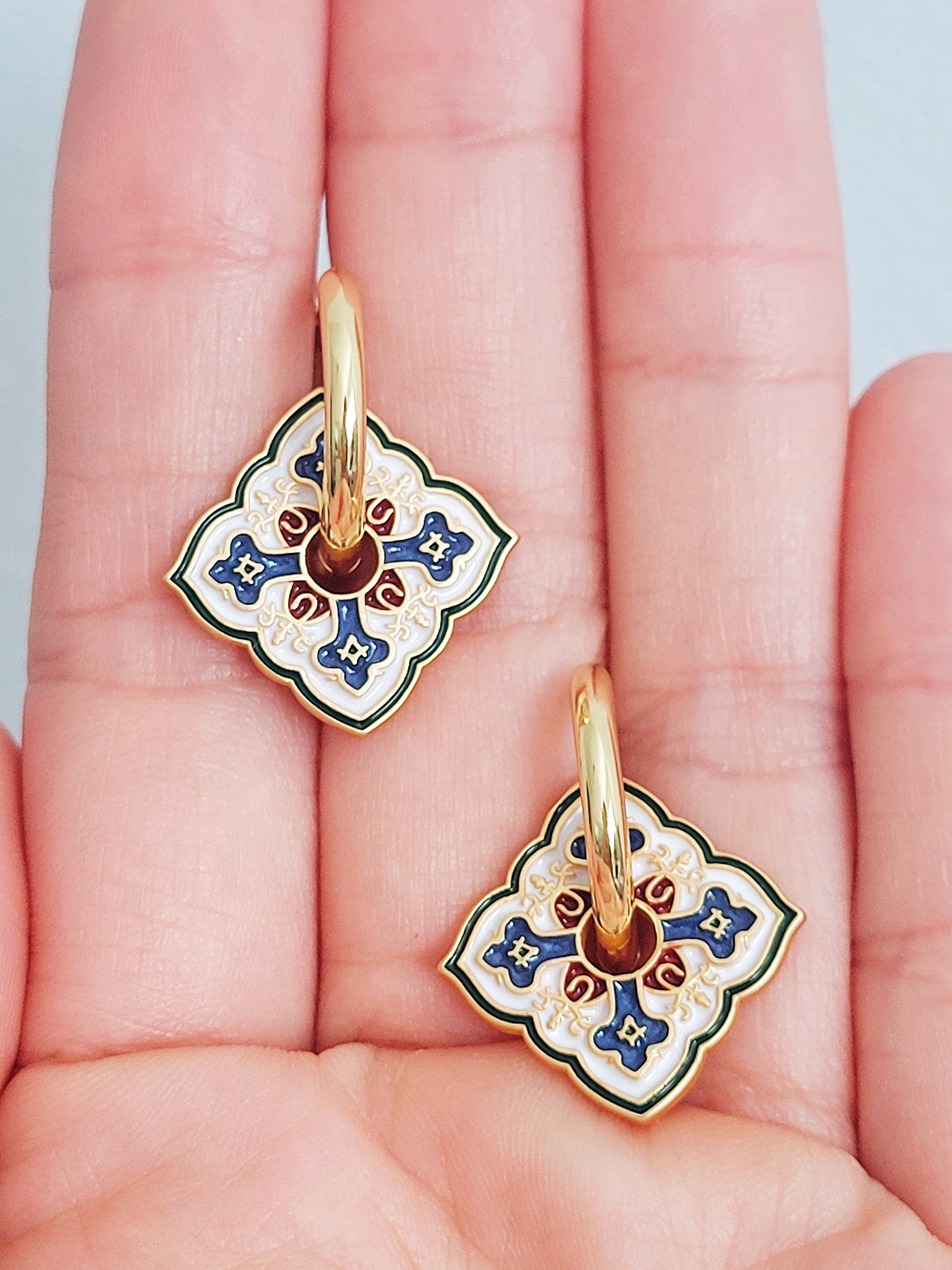 Add a vintage touch of elegance to your style with these Enamel Gothic Cross Hoop Earrings. Impeccably hand-painted with intricate enamel in a traditional tile pattern, these Gothic-inspired earrings offer a unique and high-quality design. Their detailed craftsmanship showcases a retro look and attention to detail that will elevate any outfit. Enhance your wardrobe with these stunning Gothic hoop earrings.