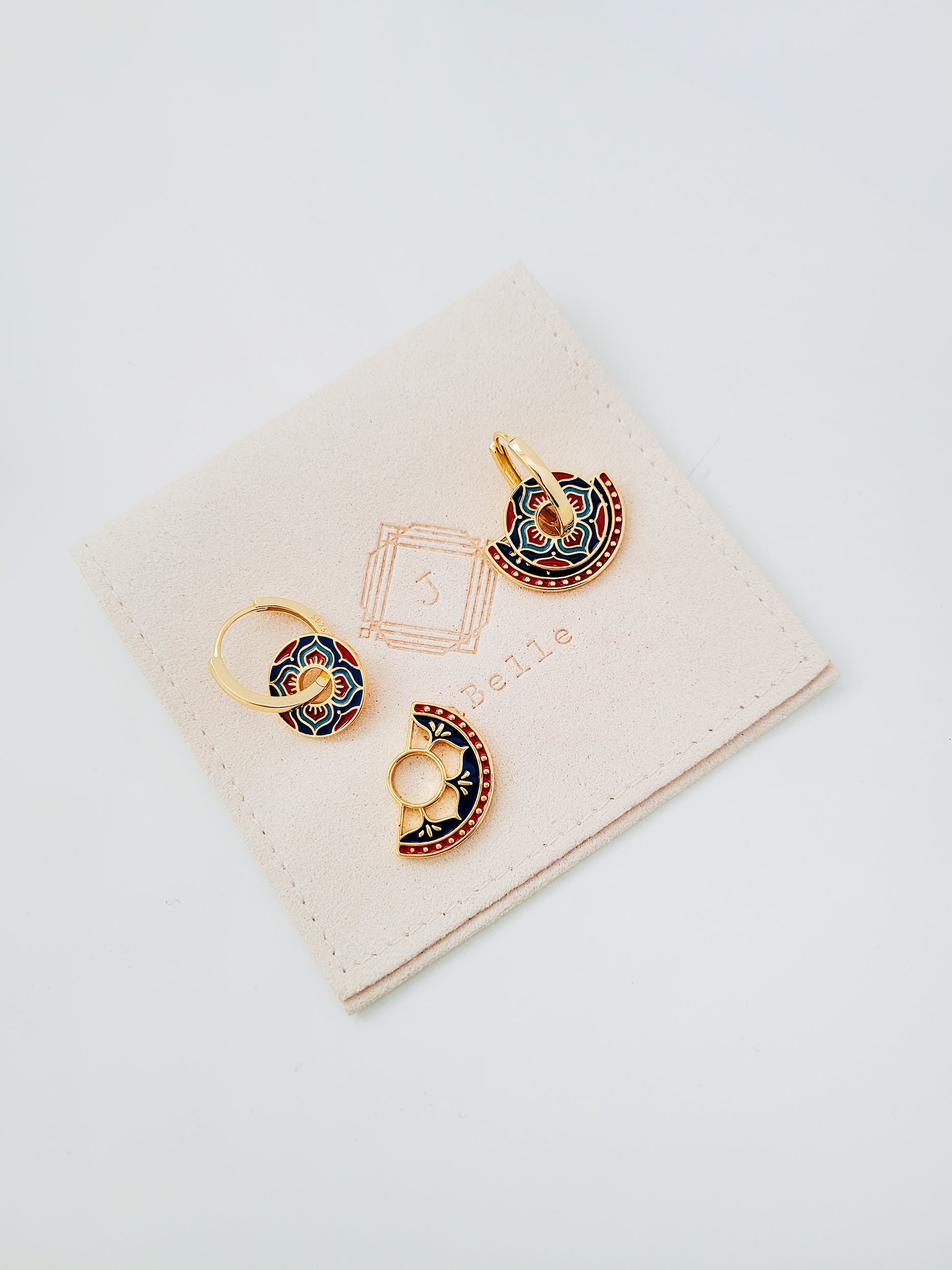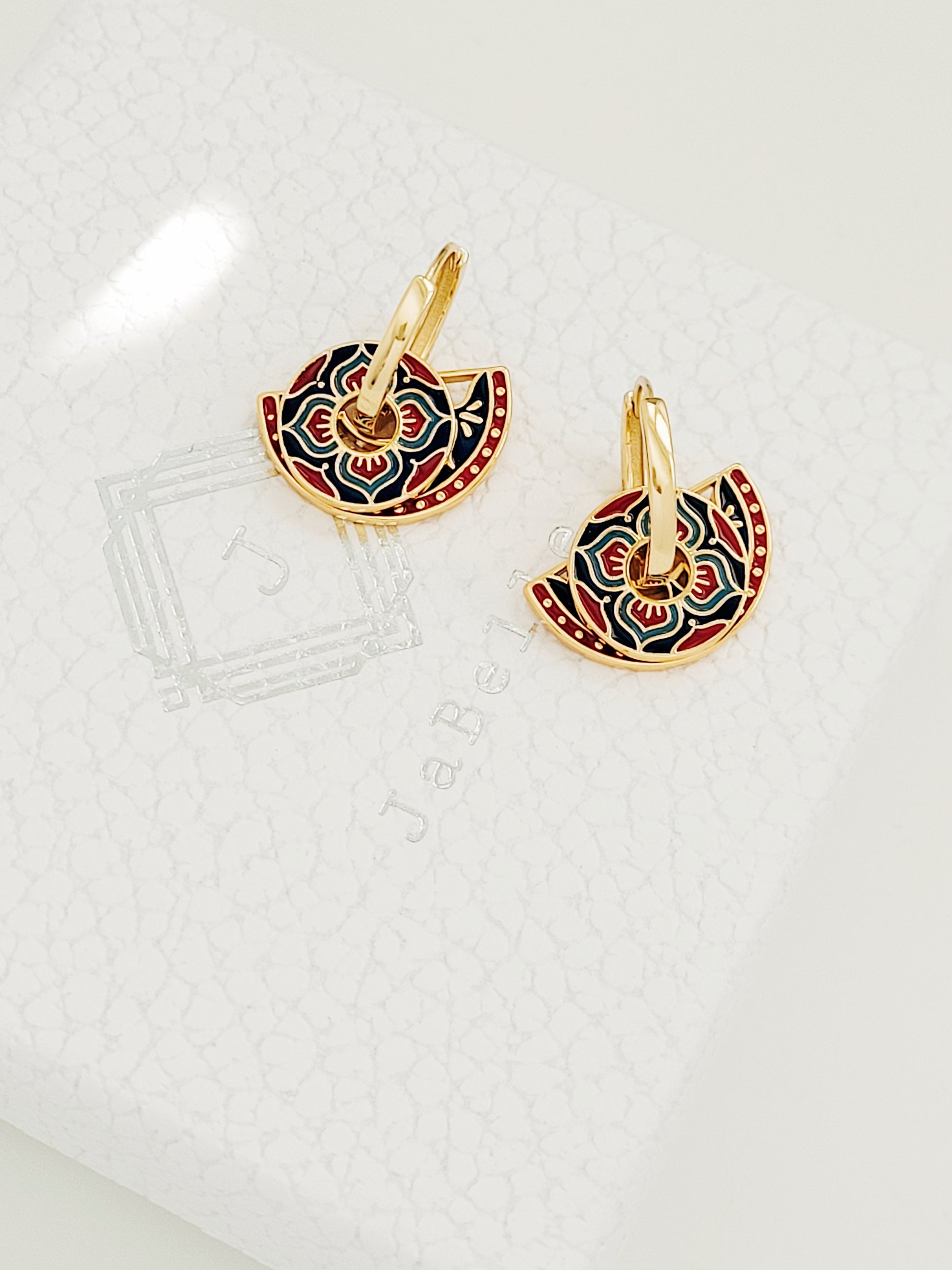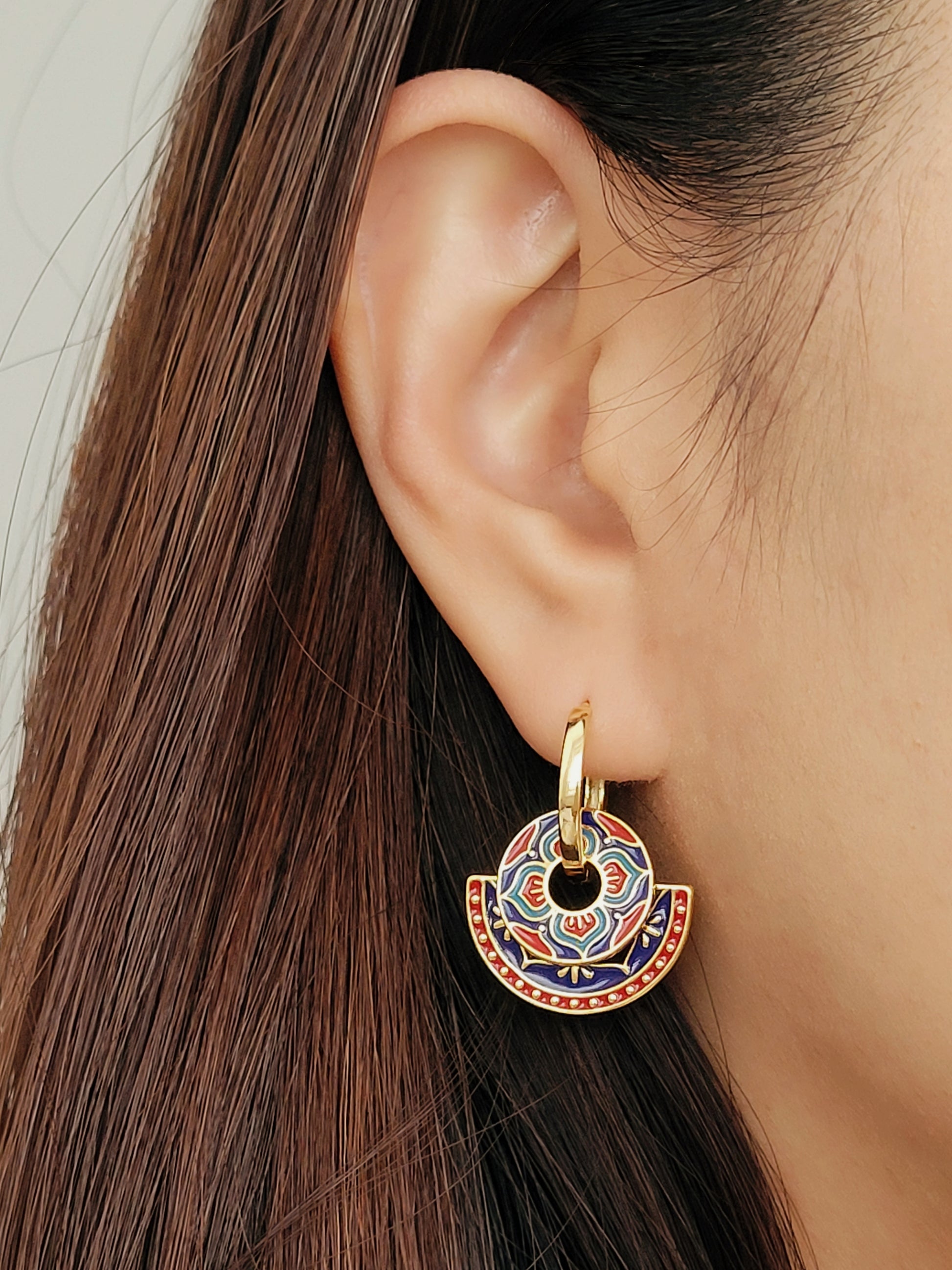 Discover the timeless elegance and beauty of our Enamel Tile Pattern Earrings. Each pair is crafted in 18ct gold plated brass and hand-painted with intricate enamel, these earrings showcase a perfect blend of traditional vintage, classic, and modern styles. They are not only a pair of earrings, but a piece of art. Get ready to turn heads and make a statement with our stunning Enamel Tile Pattern Earrings!