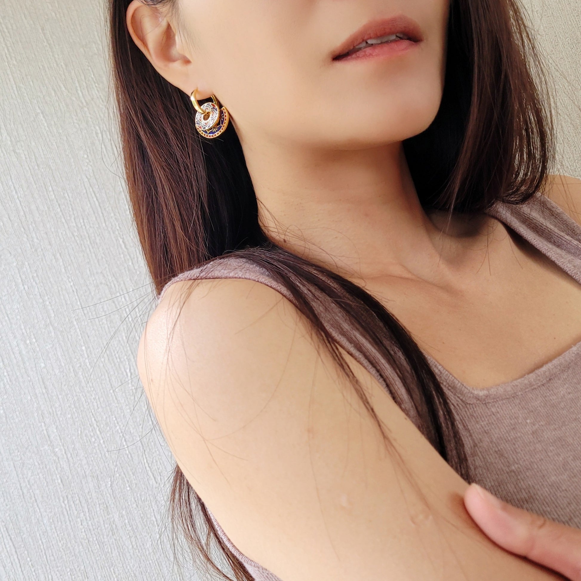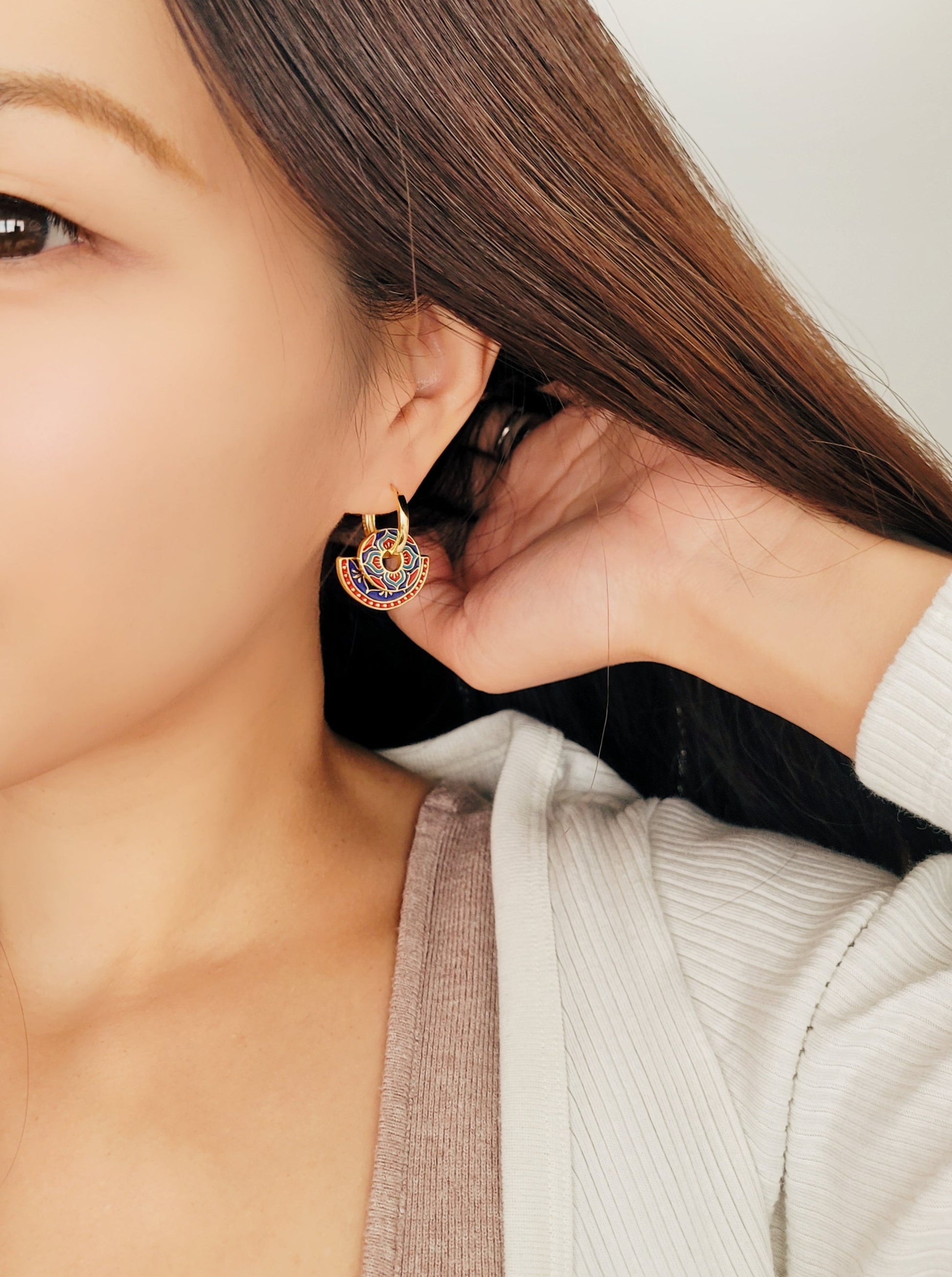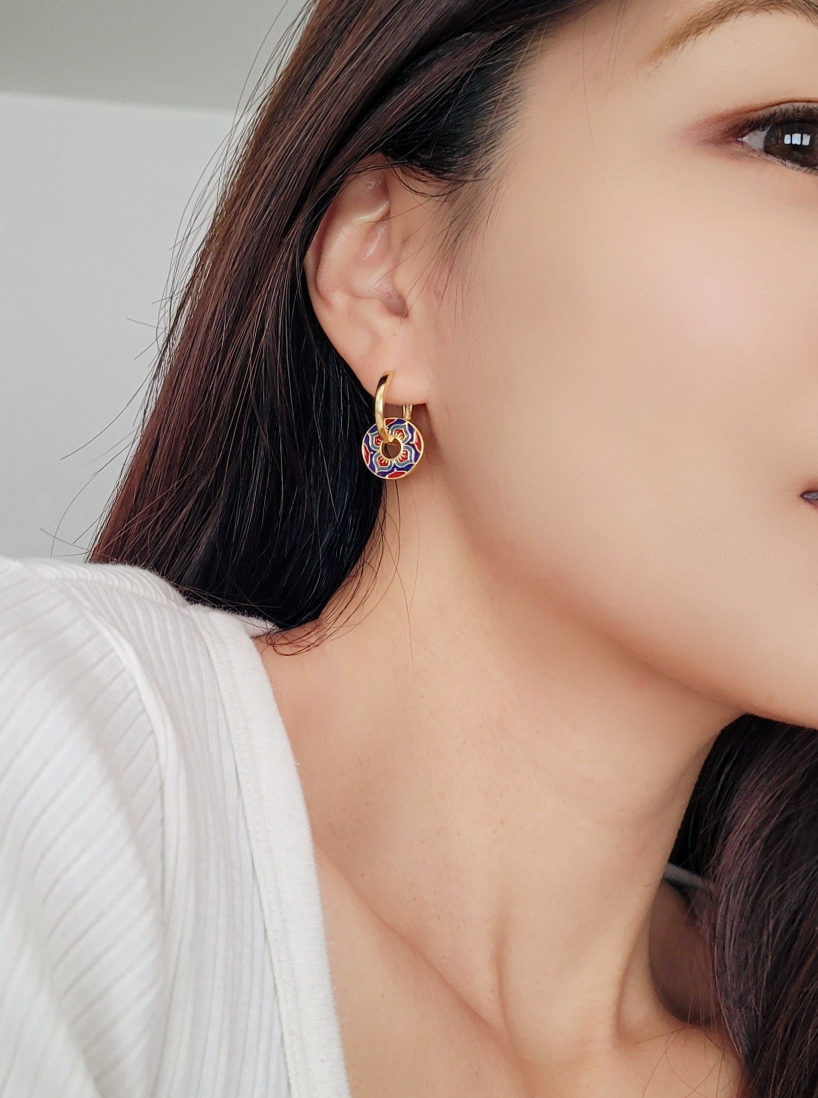 Discover the timeless elegance and beauty of our Enamel Tile Pattern Earrings. Each pair is crafted in 18ct gold plated brass and hand-painted with intricate enamel, these earrings showcase a perfect blend of traditional vintage, classic, and modern styles. They are not only a pair of earrings, but a piece of art. Get ready to turn heads and make a statement with our stunning Enamel Tile Pattern Earrings!