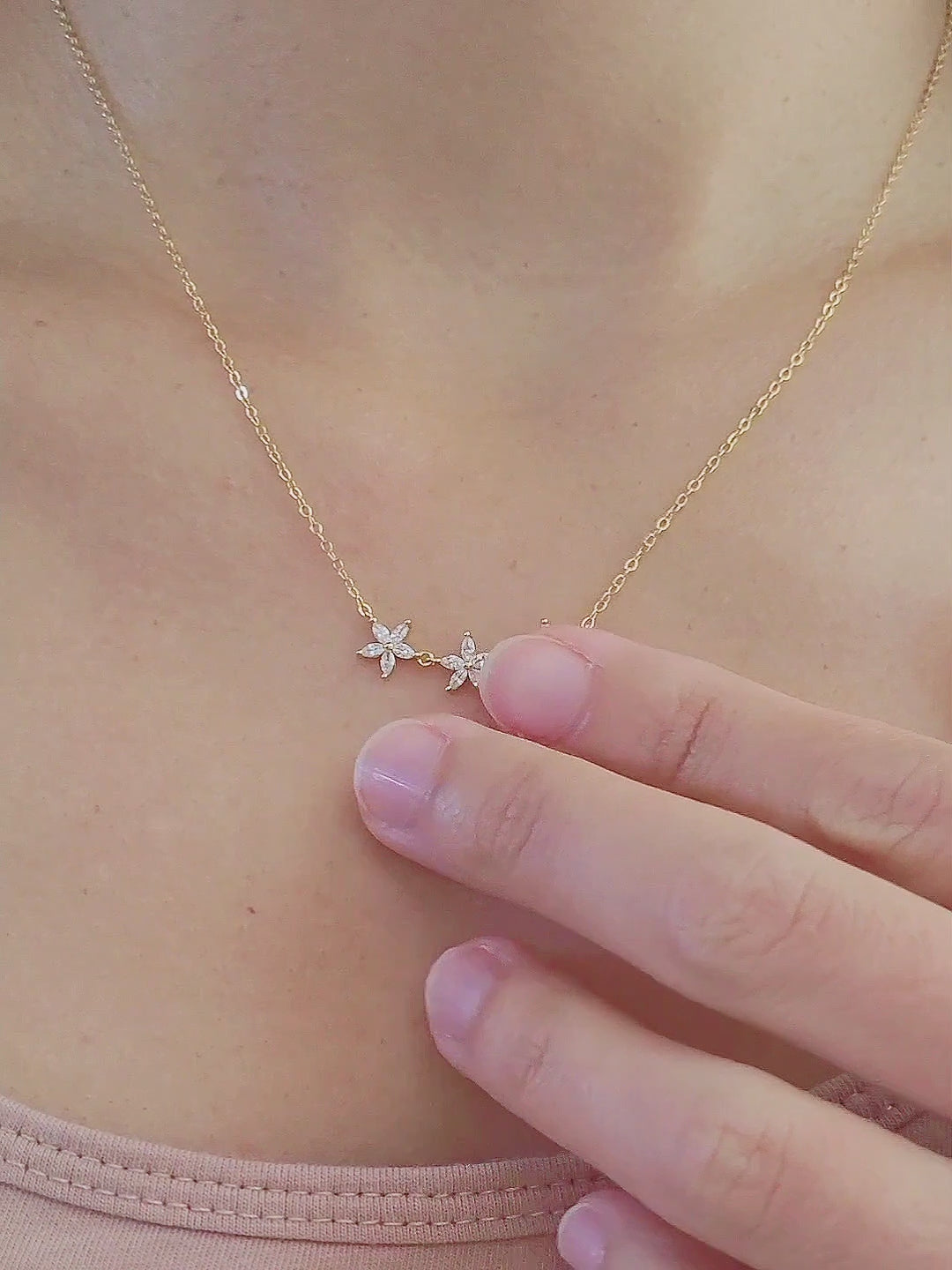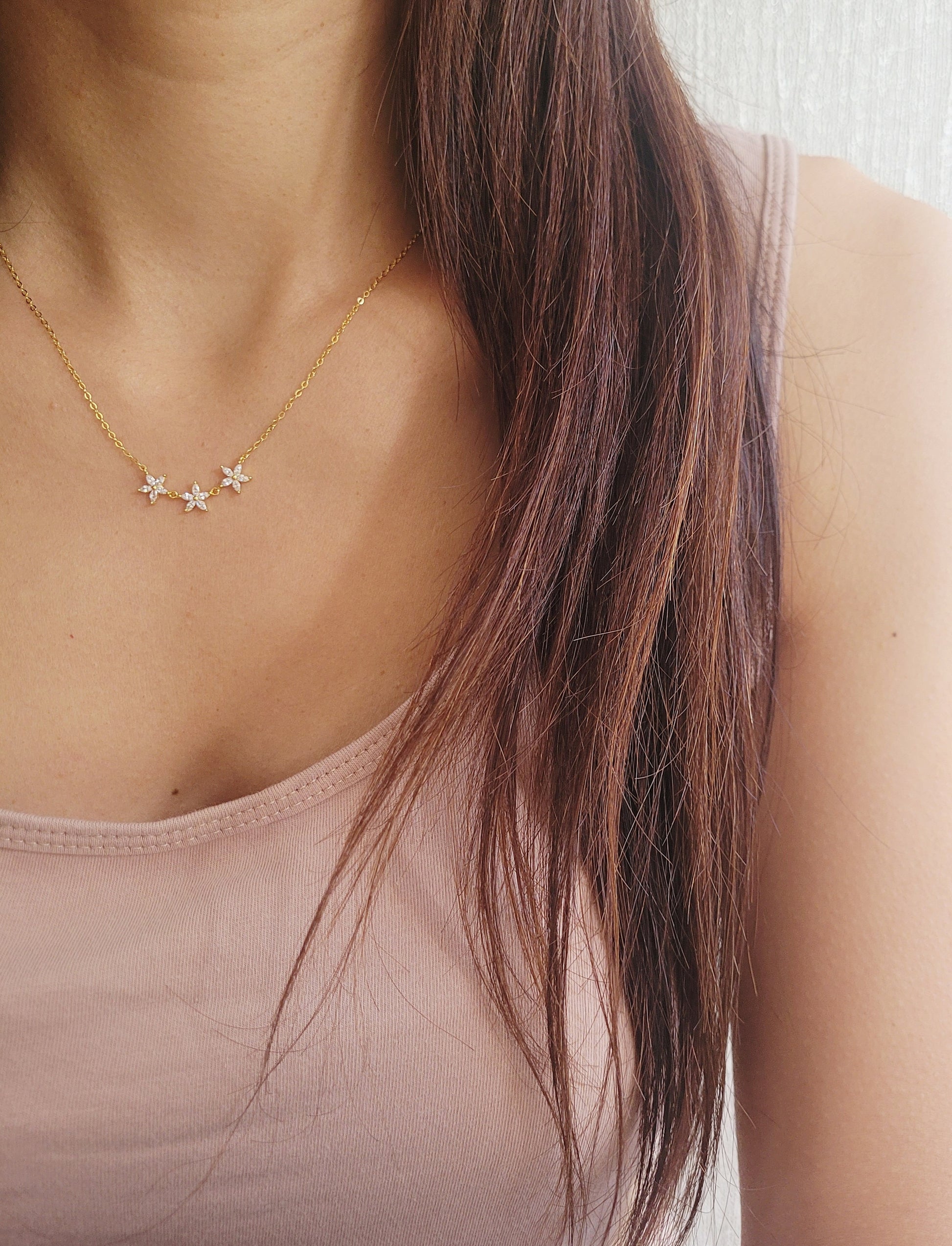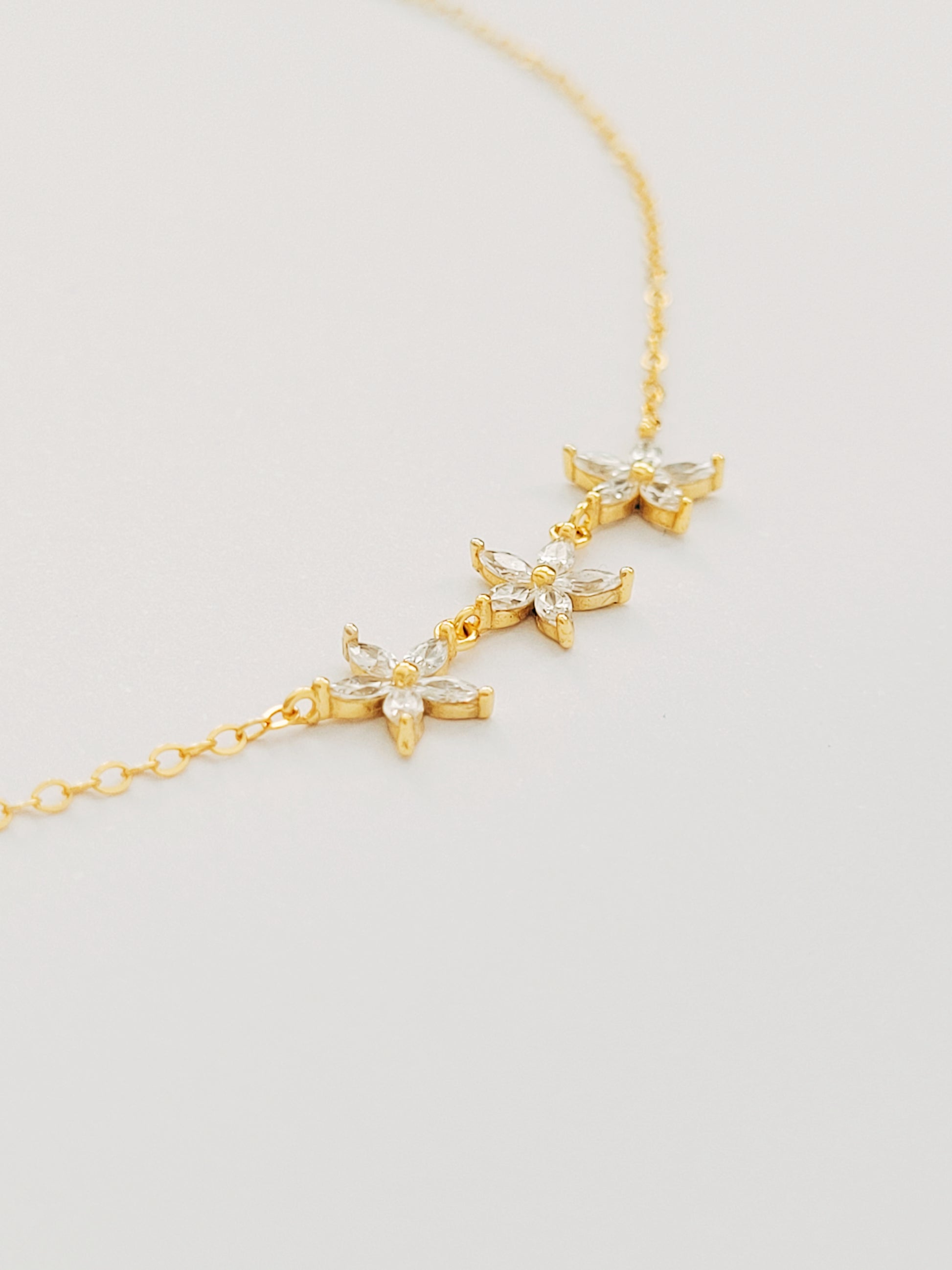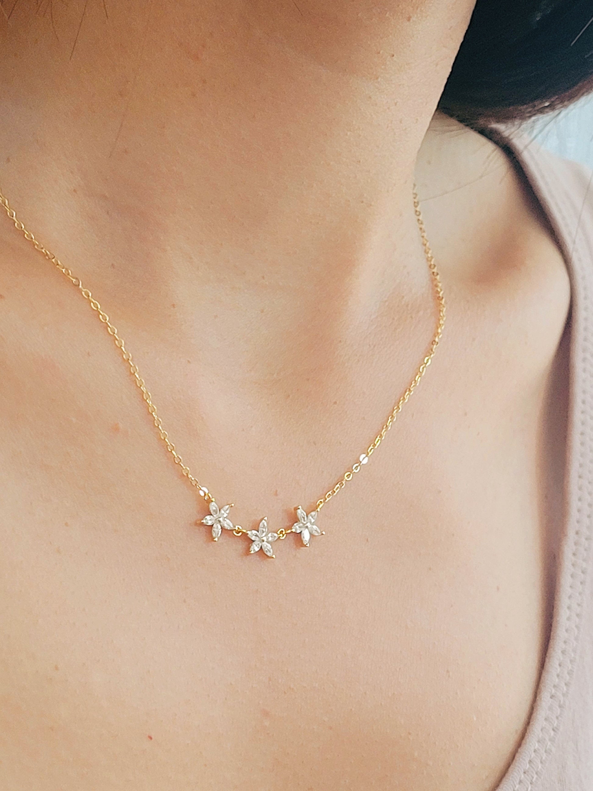This delicate Triple Marquise Flower Necklace is crafted in gold plated over sterling silver, featuring three marquise cz diamond flowers on simple gold chain. It combines timeless design with modern elegance, perfect gift idea for daughter, girlfriend or sisters.
