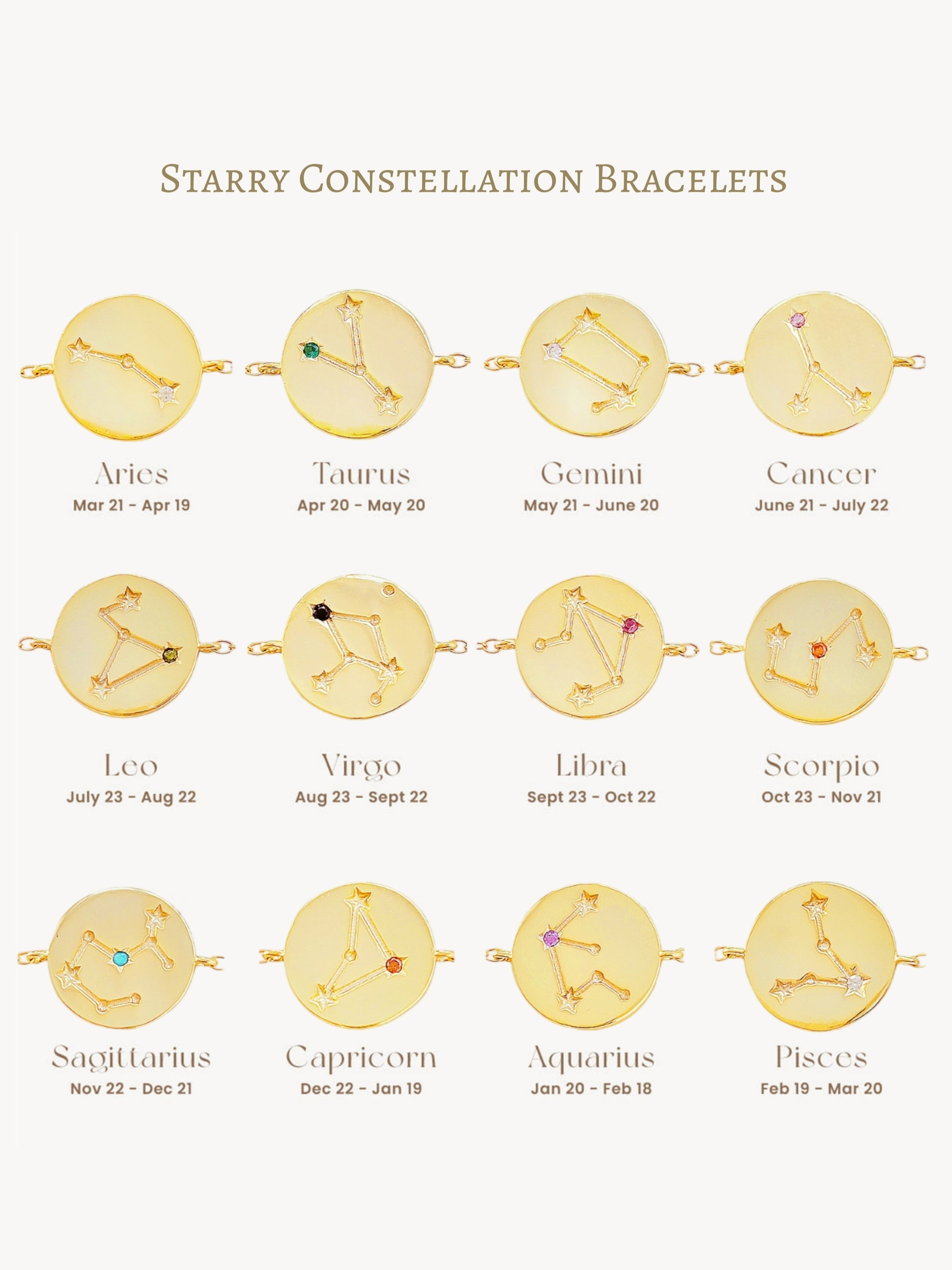 Celebrate your star sign with this beautiful Zodiac Constellation Bracelet! Each charm is delicately hand-stamped with your zodiac constellation and accented with a birthstone, creating a personalized touch to this elegant gold-plated bracelet.