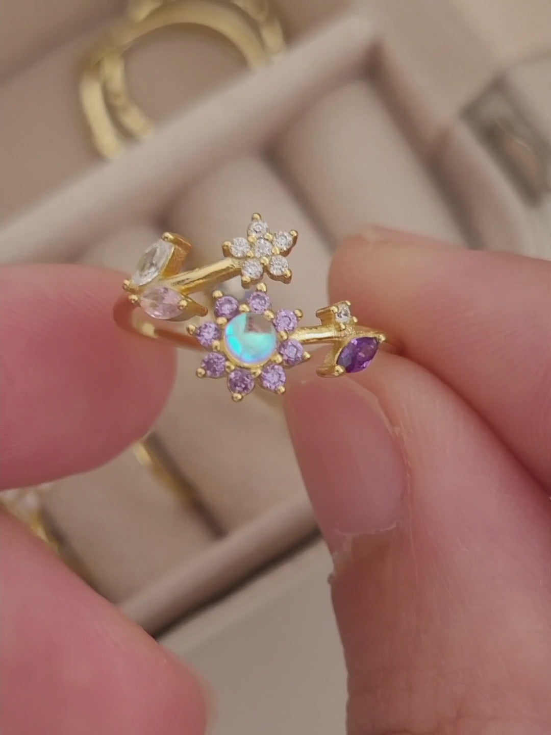 This exquisite Sunflower Ring showcases the timeless beauty of sunflowers, symbolizing adoration, loyalty, and longevity. With a stunning moonstone at its center, this ring is the perfect choice for weddings and promises of eternal love. Add a touch of sophistication and elegance to any occasion with this delicate and meaningful piece.