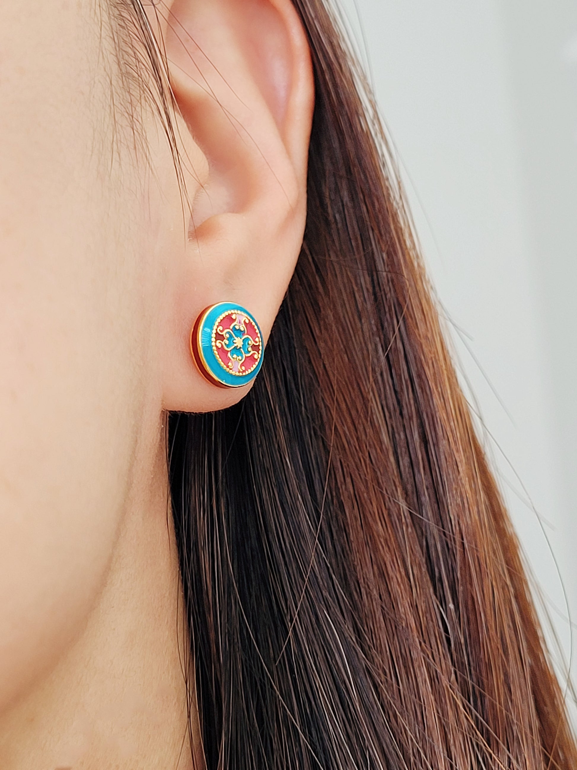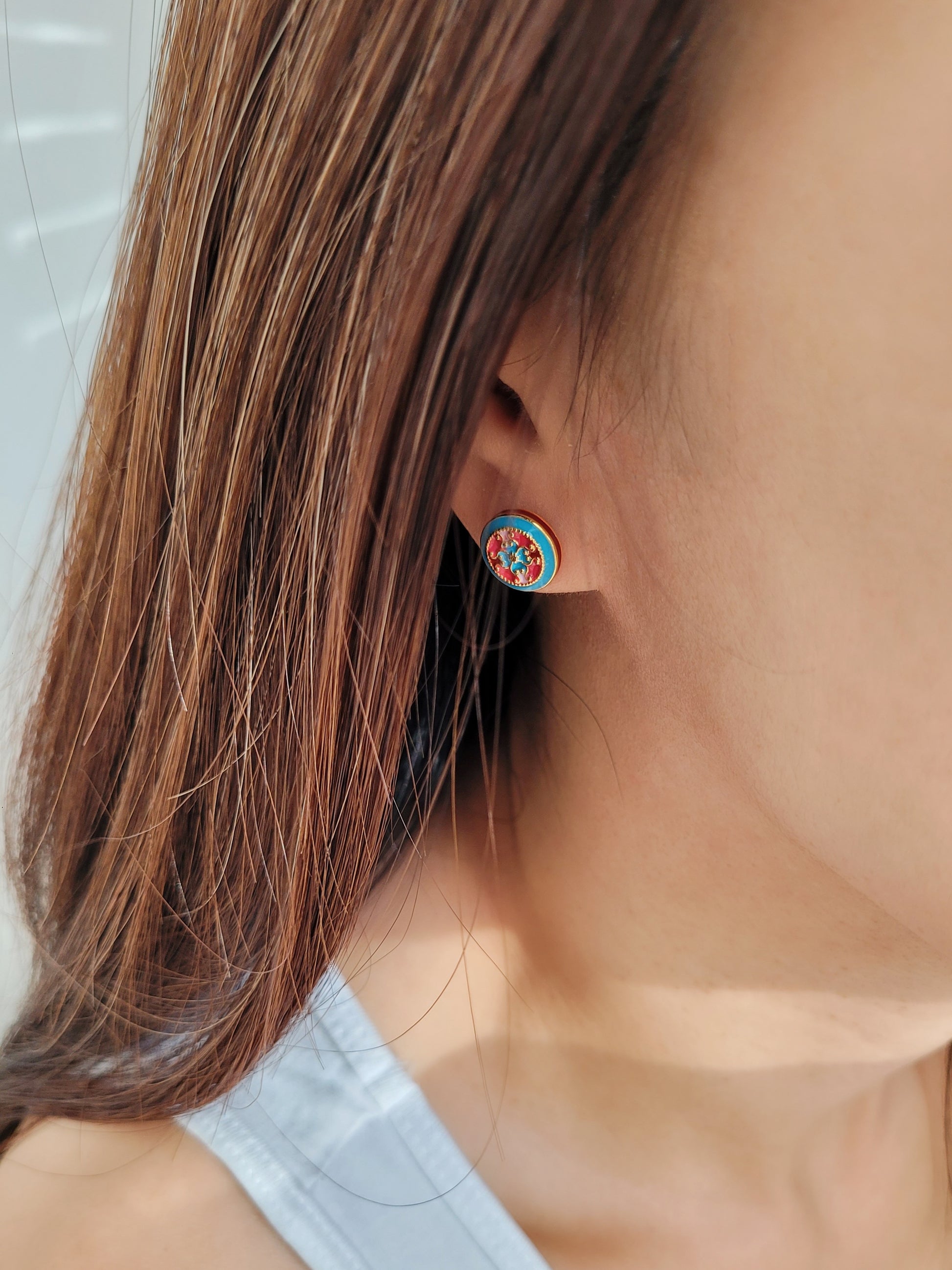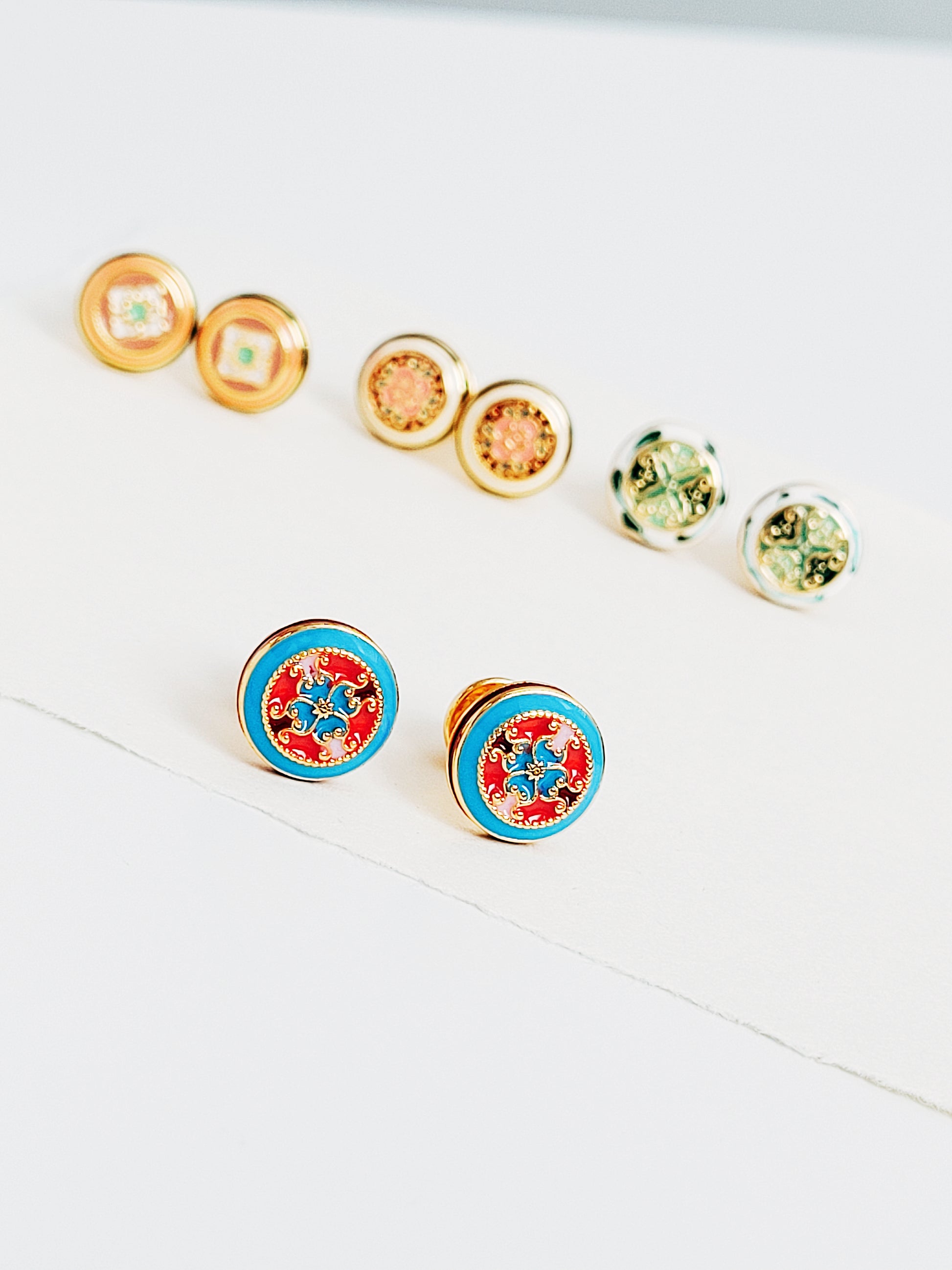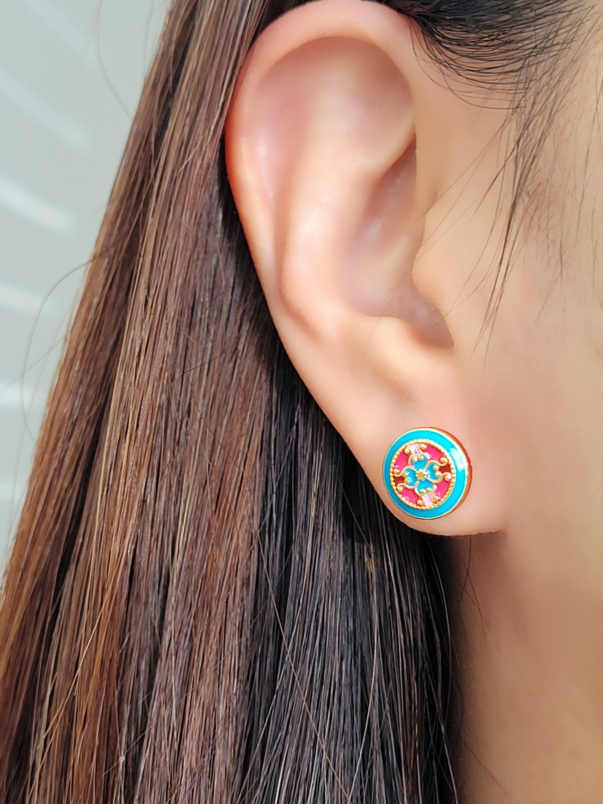 Bring a touch of retro flair to your wardrobe with these vibrant hand-painted enamel earrings featuring a unique vintage tile pattern! Add a pop of color and style to any outfit with these modern statement pieces. No need to worry about them going out of style - their timeless design will always be in fashion!