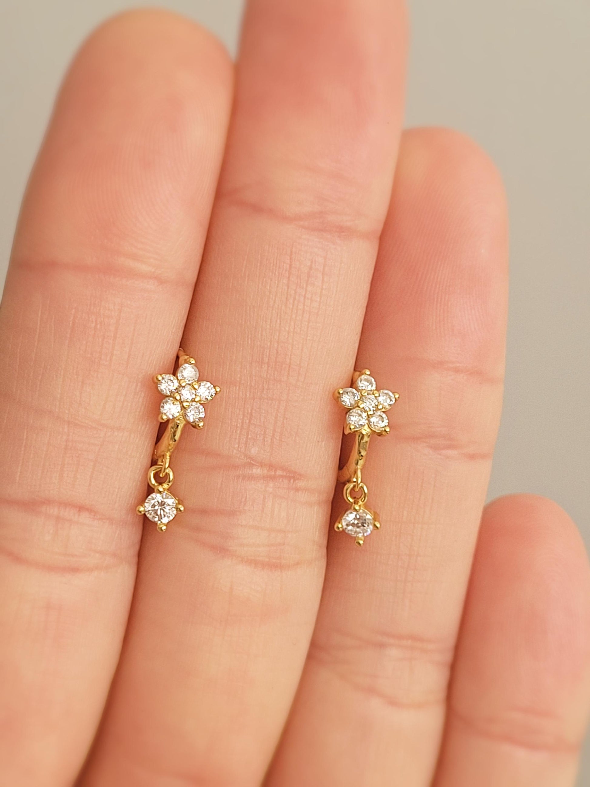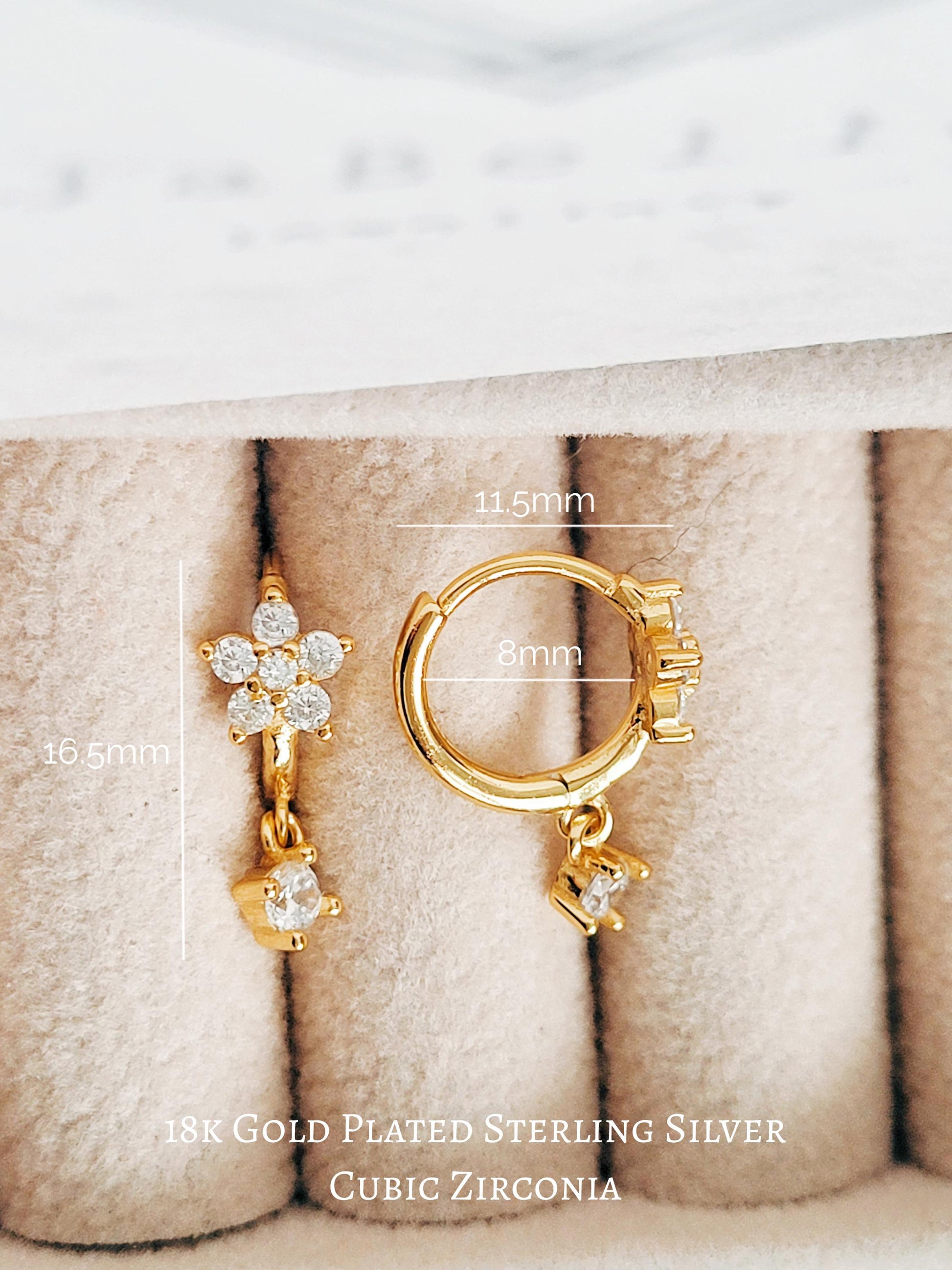 Delight in the beauty of these sparkling flower huggie earrings, designed with elegance and charm. Crafted in 18k gold plated sterling silver, they feature vibrant cubic zirconia stones forming delicate blossoms with a petite dangling charm for added movement.